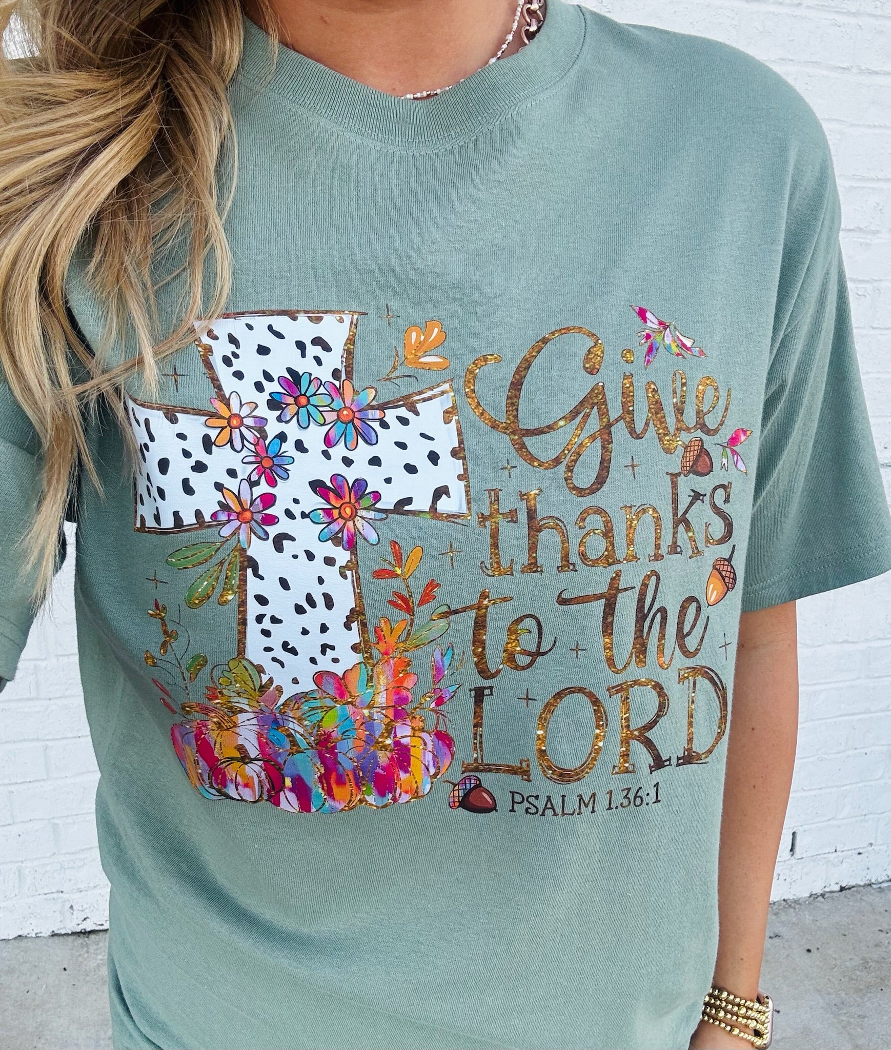 Spread gratitude in style with this vibrant green graphic tee featuring an inspiring Bible verse. Perfect for Thanksgiving gatherings or everyday wear, this playful tee combines comfort with meaningful messaging. The eye-catching design makes it a conversation starter while keeping your faith front and center. Whether you're celebrating the season or simply living out your values, this tee lets your spirit shine through. A wardrobe essential that feels good and looks great.