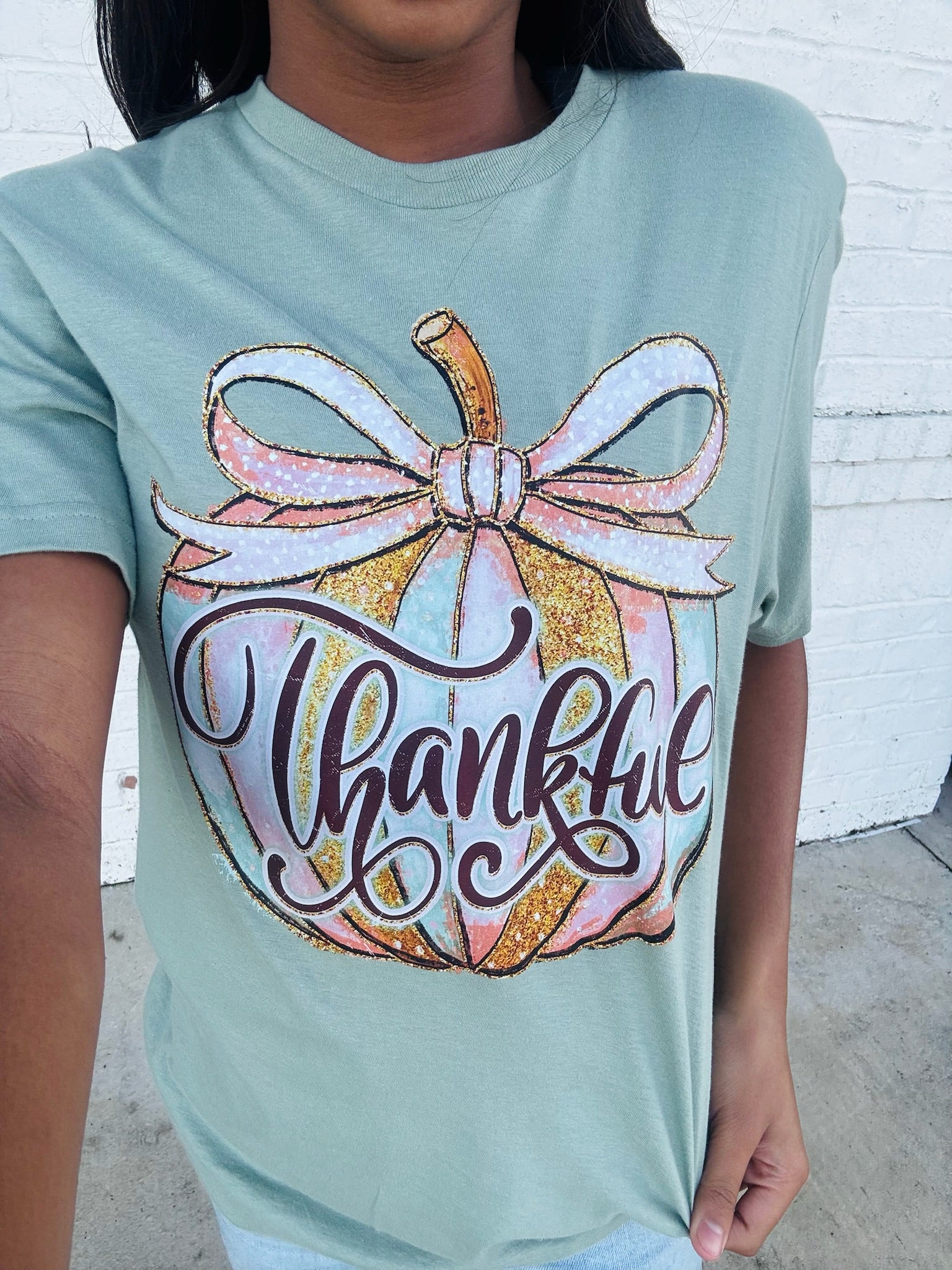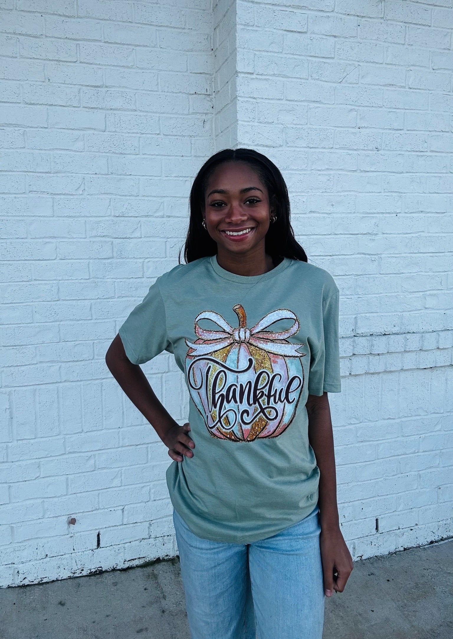 Celebrate the season in style with this cheerful green tee featuring a charming pumpkin graphic and "Thankful" message. Perfect for Thanksgiving gatherings, casual autumn outings, or anyone who loves spreading gratitude with a smile. Soft, comfortable, and festive—your new go-to piece for fall festivities and cozy seasonal vibes.