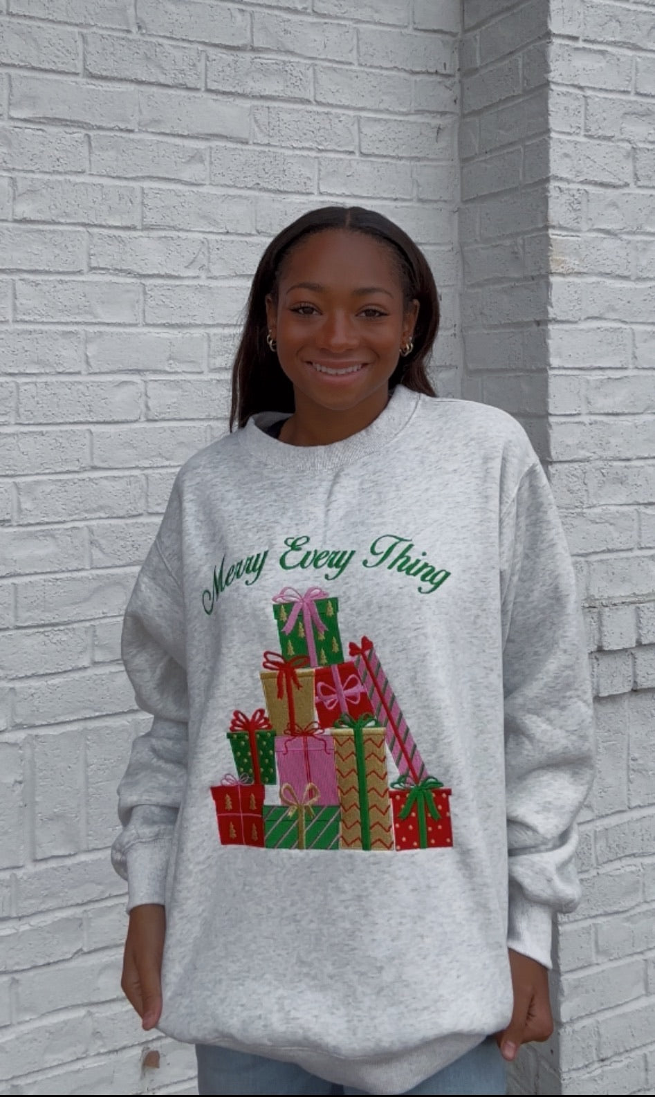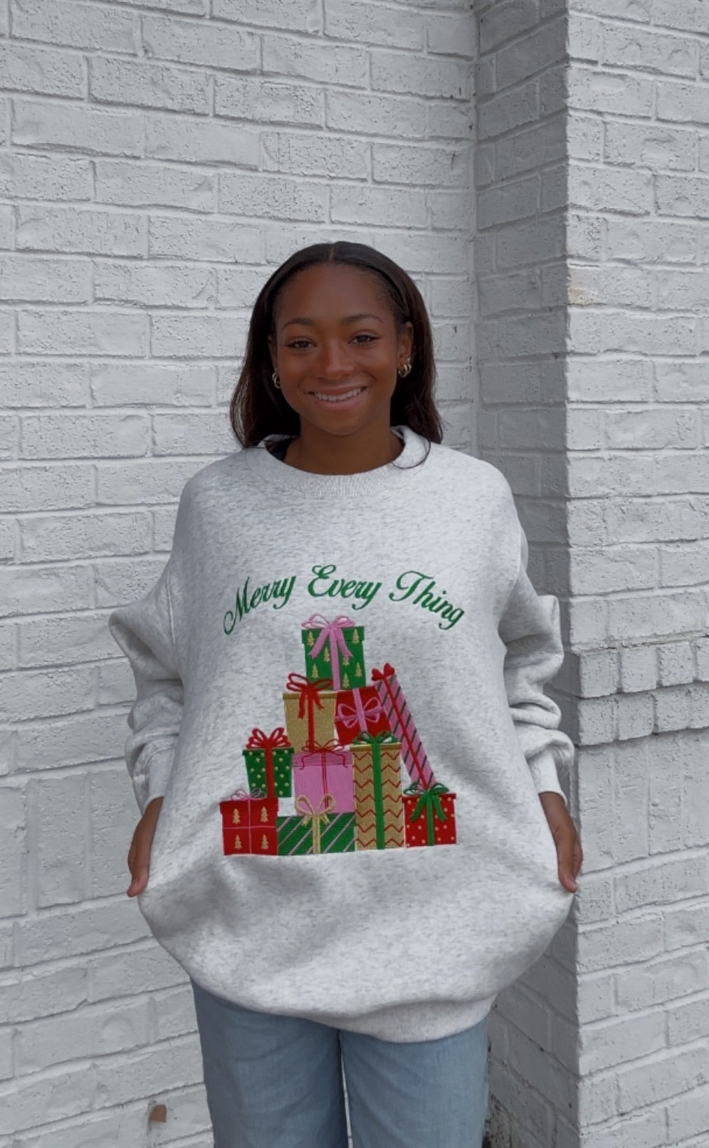 Wrap yourself in cozy comfort with this light gray sweatshirt featuring cheerful "Merry Everything" embroidery. Perfect for spreading holiday cheer or everyday wear, this soft pullover pairs effortlessly with your favorite jeans or loungewear. The playful embroidered message adds a touch of festive fun to any outfit, making it an instant wardrobe favorite for the season and beyond.