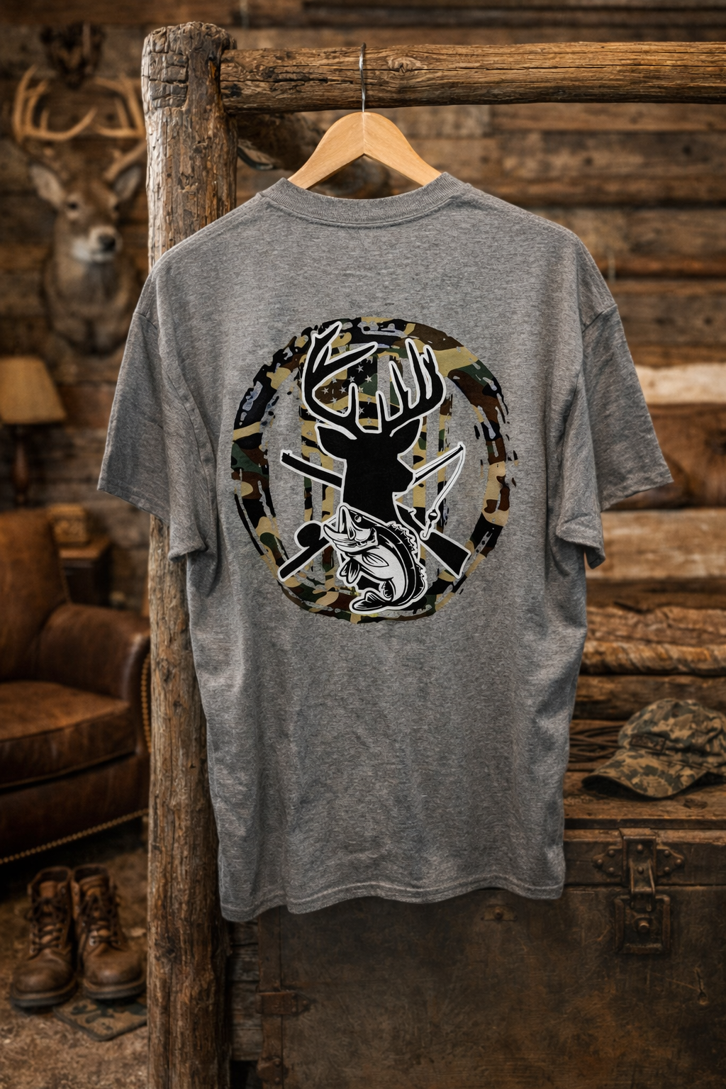 Get ready for your next outdoor adventure with our Hunting & Fishing Tee! Made from a comfortable gray fabric, this t-shirt features a unique camo design on the back that will appeal to all hunting and fishing enthusiasts. Perfect for a day in the woods or on the water, this tee combines style and functionality in one.
