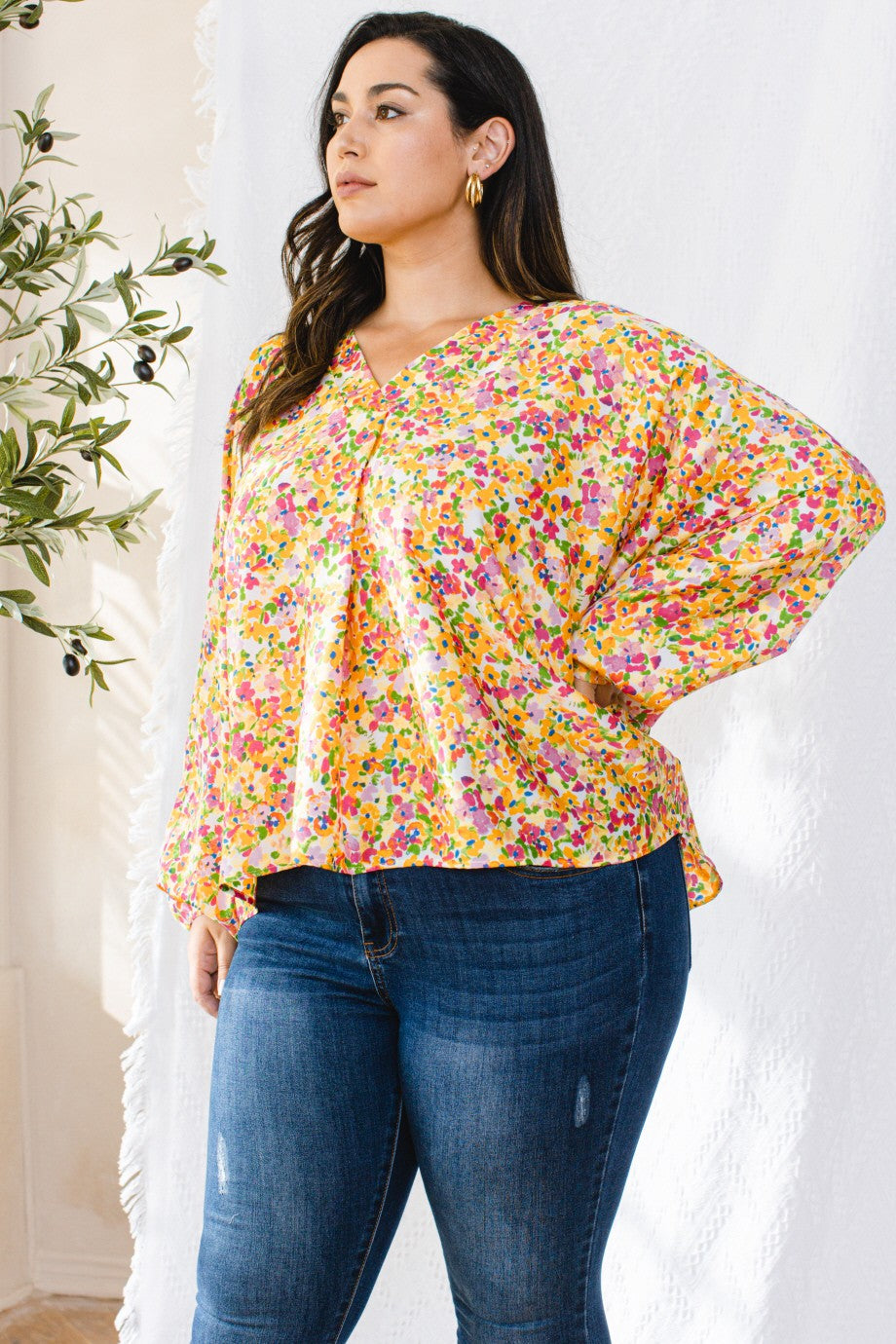 Embrace effortless elegance with this charming ditsy floral blouse. Featuring a relaxed oversized silhouette and dramatic batwing sleeves, it's perfect for layering or wearing solo. The delicate watercolor florals bring a whimsical touch, while the V-neck with band detail adds a polished finish. Versatile enough for casual days or dressed-up occasions, this blouse is your new go-to for comfortable, stylish vibes.