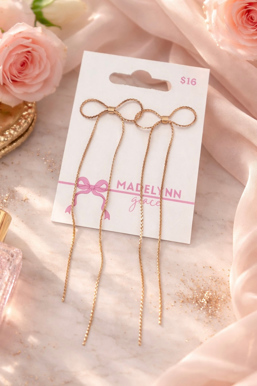 Add a touch of elegance and playfulness to your outfit with the Madelynn Grace Bow Chain Earrings. Made of dainty thin gold chain, these earrings feature a delicate bow design that will bring a subtle yet charming touch to your look. Perfect for any occasion and sure to receive many compliments.