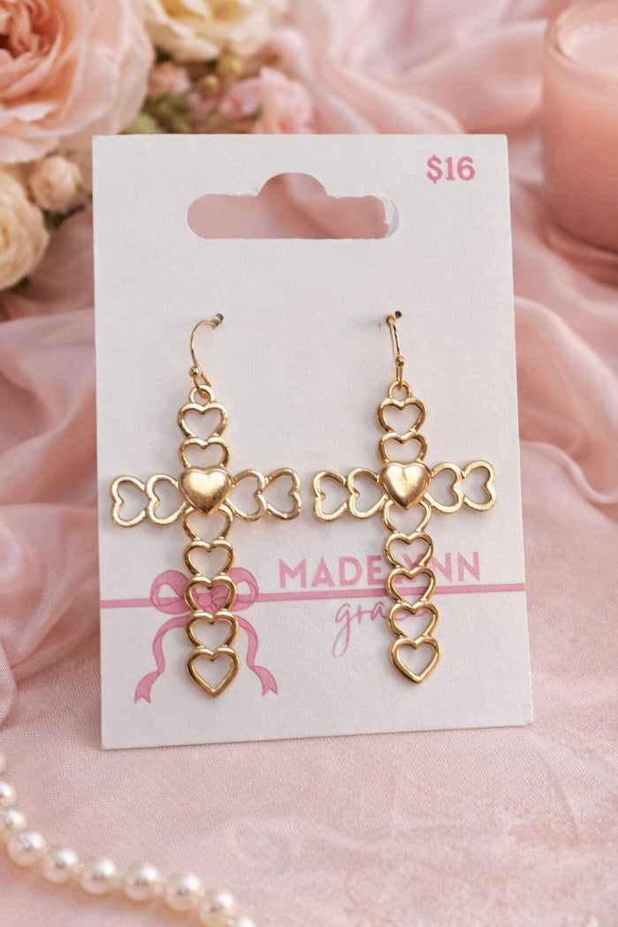 These delicate gold heart cross earrings from Madelynn Grace add a touch of femininity to any outfit. Crafted with precision and elegance, they are sure to become a staple in your jewelry collection. Reflect your faith and express your style with these charming earrings.