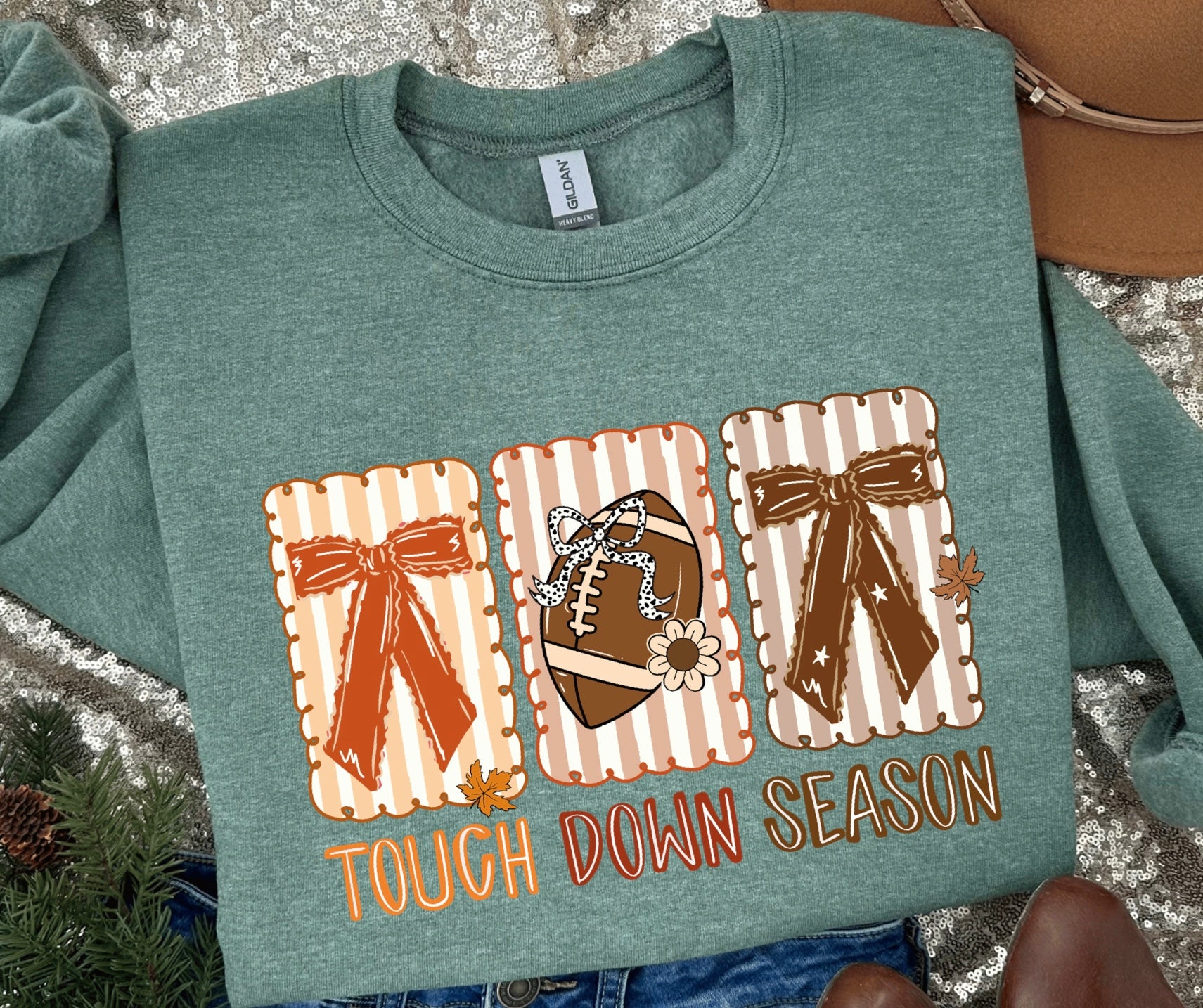 Game day just got cuter! This cozy sweatshirt combines sporty vibes with charming coquette bows for a look that scores major style points. Perfect for cheering on your team or just channeling that adorable athletic aesthetic, it's the ultimate way to show your love for football season with a feminine twist. Soft, comfortable, and undeniably sweet—your new game day favorite awaits.