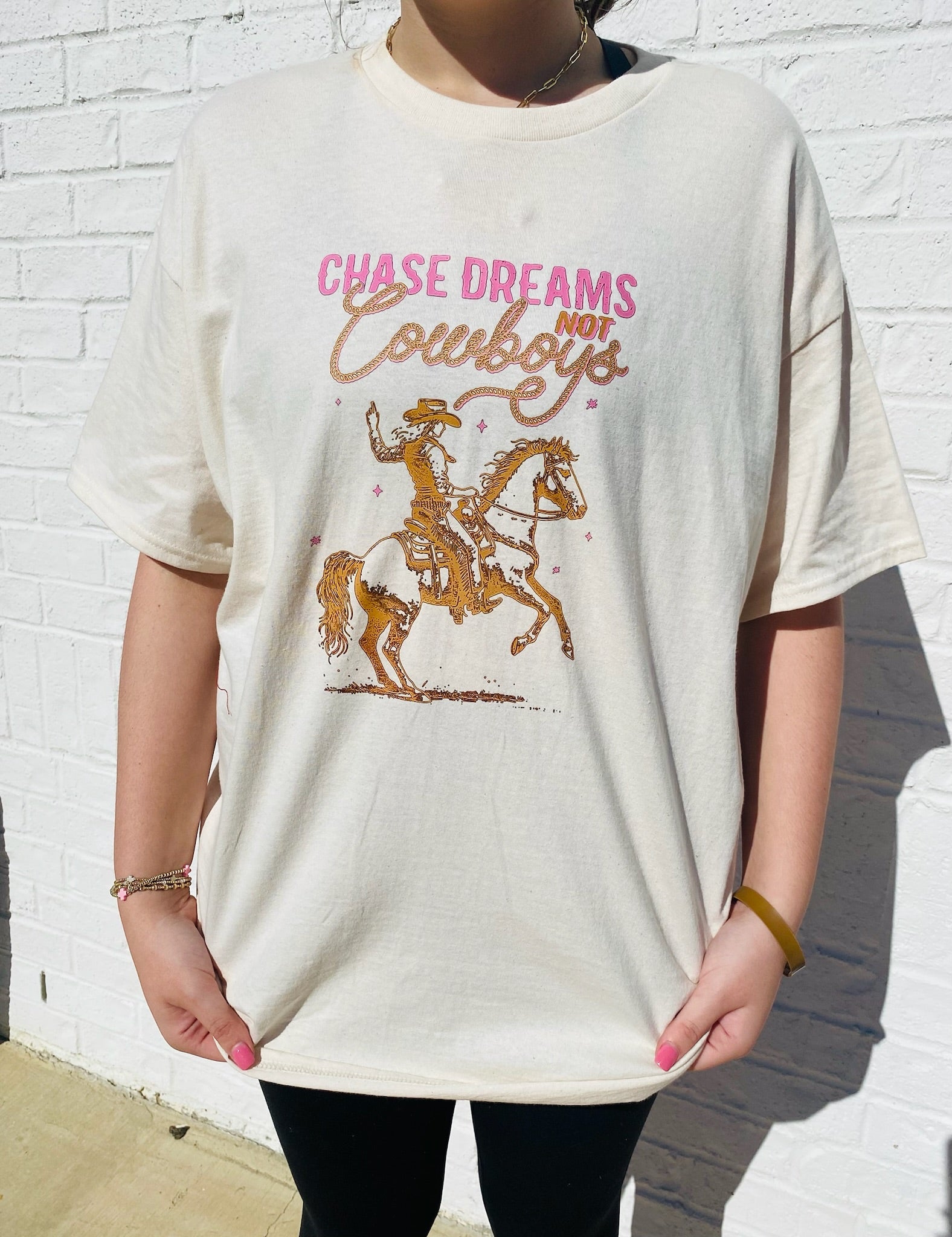 Get playful with the Chasing Dreams Not Cowboys Tee! This cute graphic tee is perfect for anyone who's not afraid to chase their dreams instead of cows. You'll love the quirky design and soft fabric that make this tee both fun and comfortable. Yee-haw!