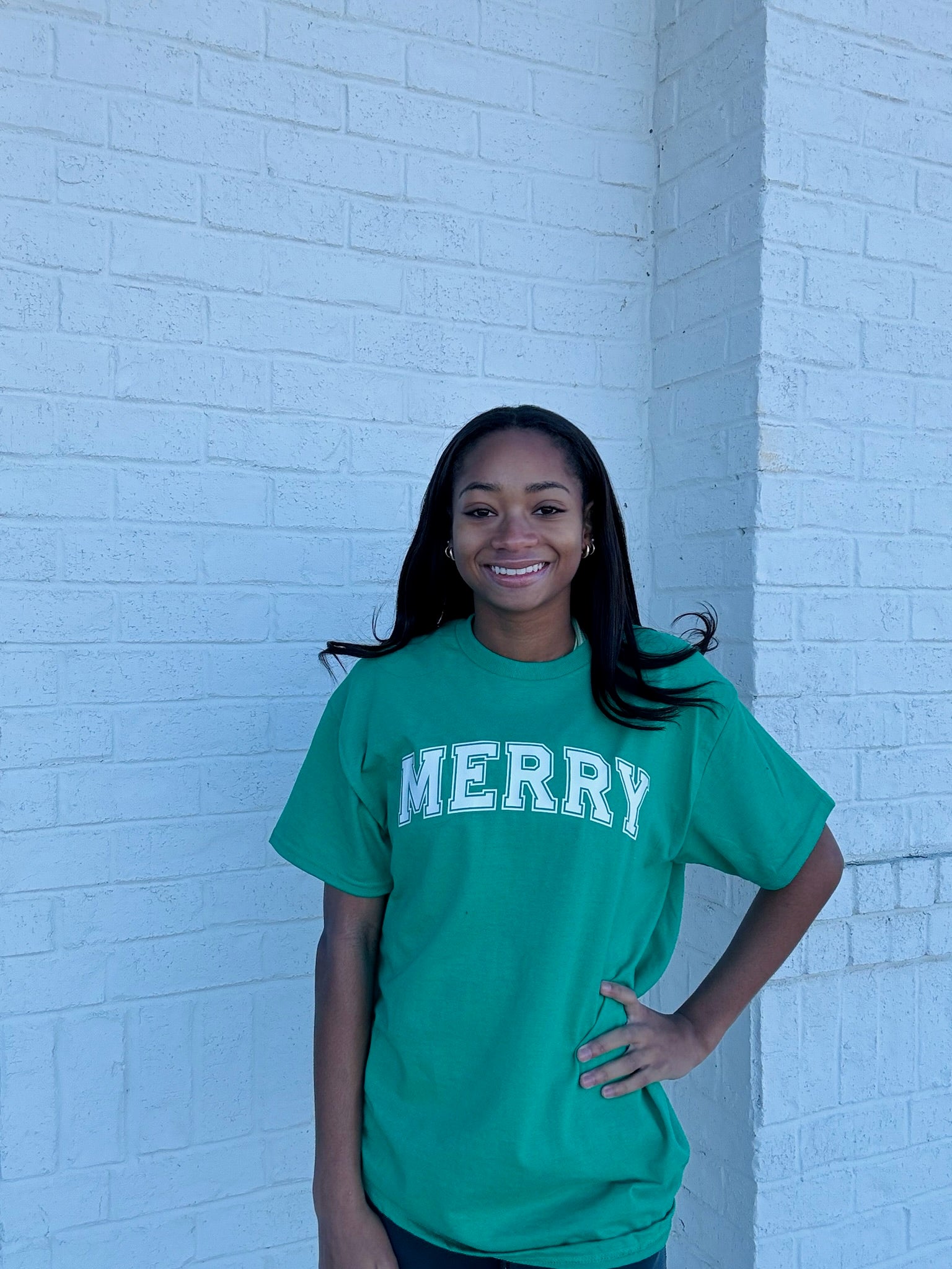 Celebrate the holiday season with our Green Merry Tee. This classic Christmas shirt is simple, yet festive, making it a perfect addition to your wardrobe. Spread holiday cheer wherever you go with this approachable and friendly tee.