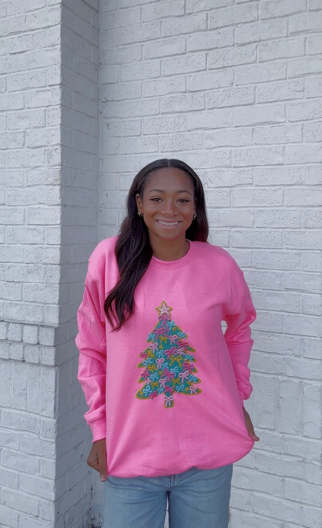 Wrap yourself in holiday cheer with this vibrant neon pink sweatshirt featuring an adorable Christmas tree that looks like yarn and topped with delicate bows. The textured design brings festive flair to your seasonal wardrobe with its whimsical, handmade aesthetic. Perfect for spreading joy and holiday spirit wherever you go. True to size for a comfortable, flattering fit.