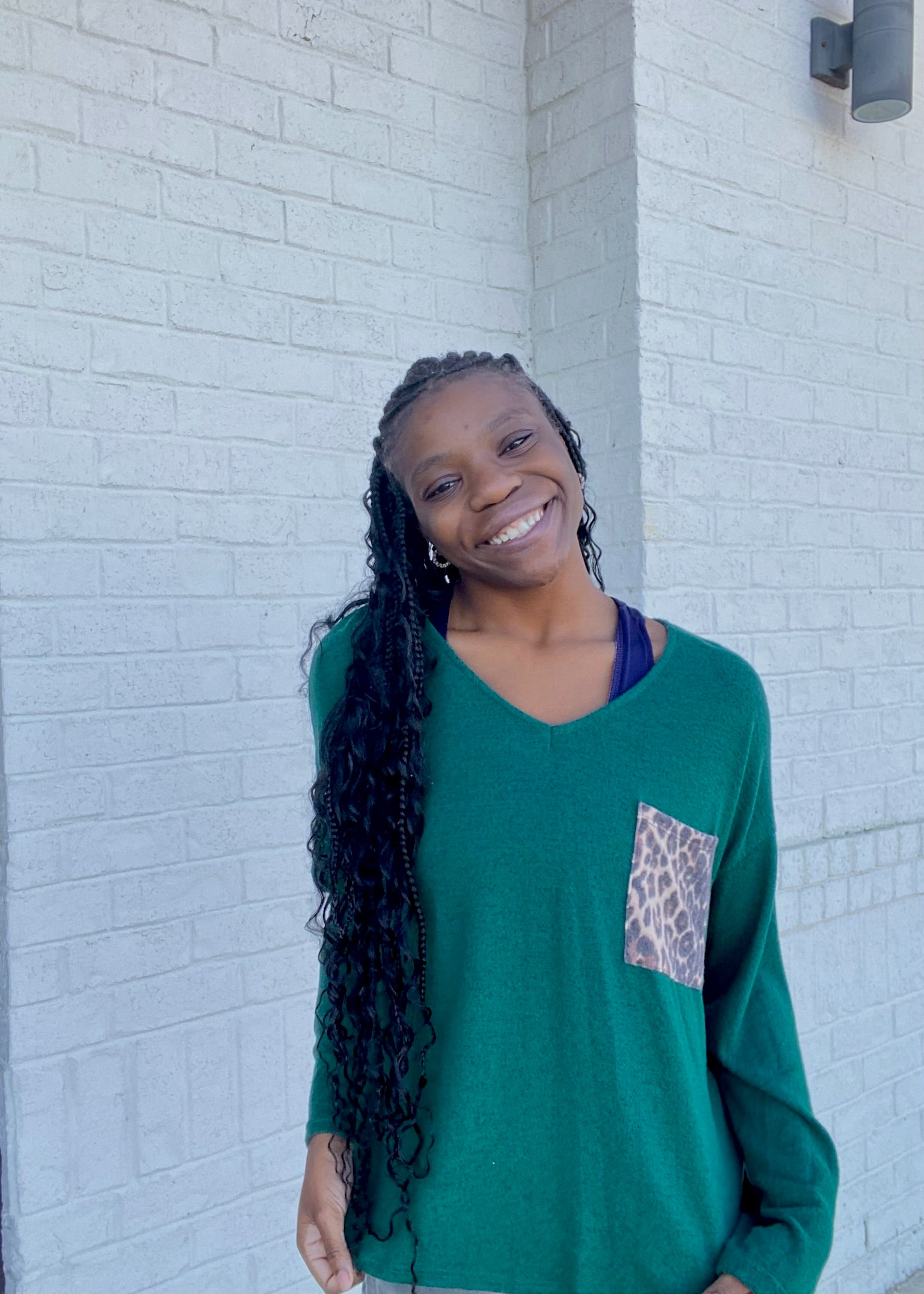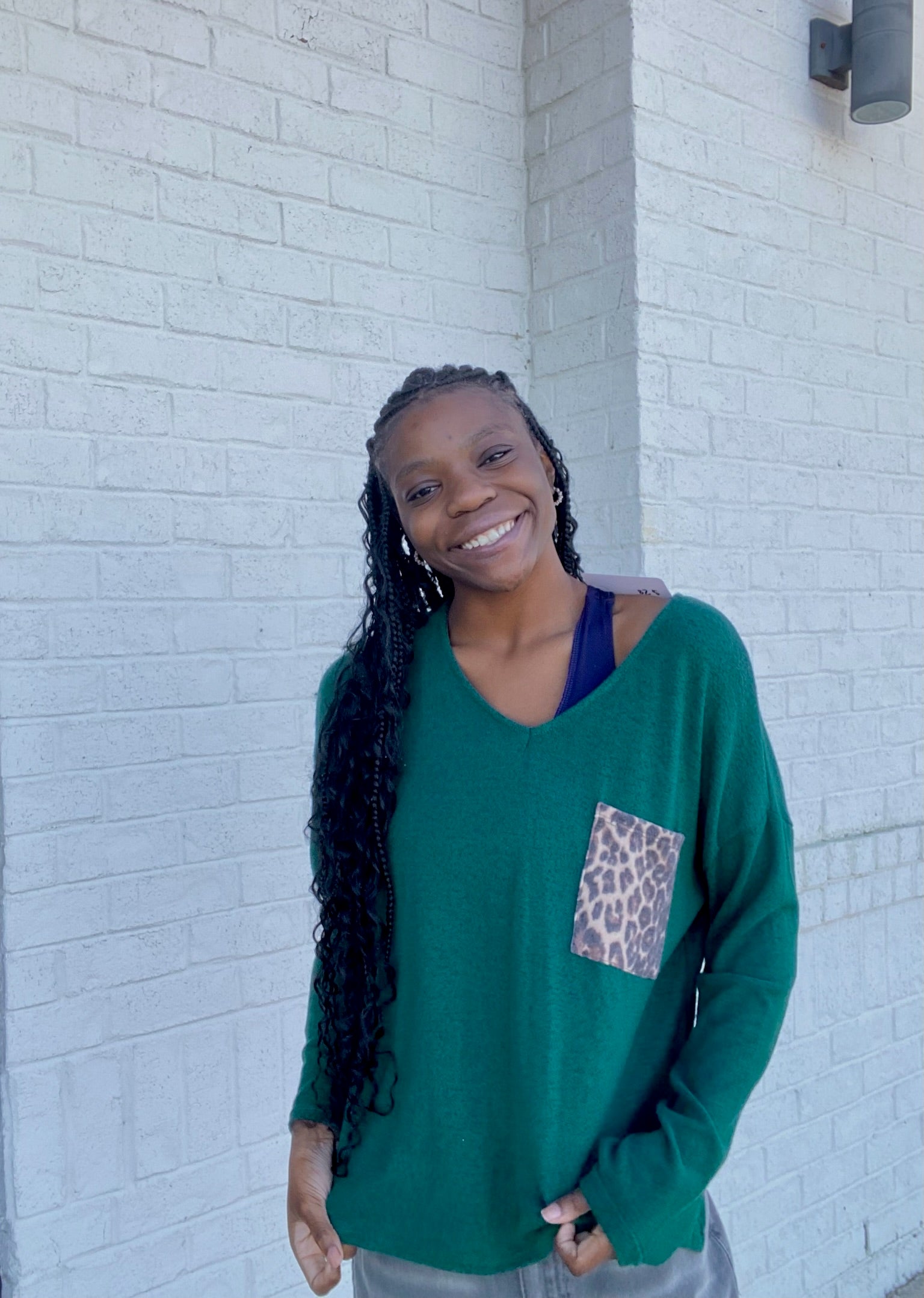 Slip into pure comfort with this delightfully soft top featuring a vibrant green base and a cheeky leopard-print pocket on the front. Perfect for casual days when you want to look effortlessly put-together without sacrificing coziness. The luxuriously soft fabric feels amazing against your skin, making it your new go-to piece for relaxed style. Whether you're running errands or hanging with friends, this playful top brings a touch of wild fun to your everyday wardrobe.